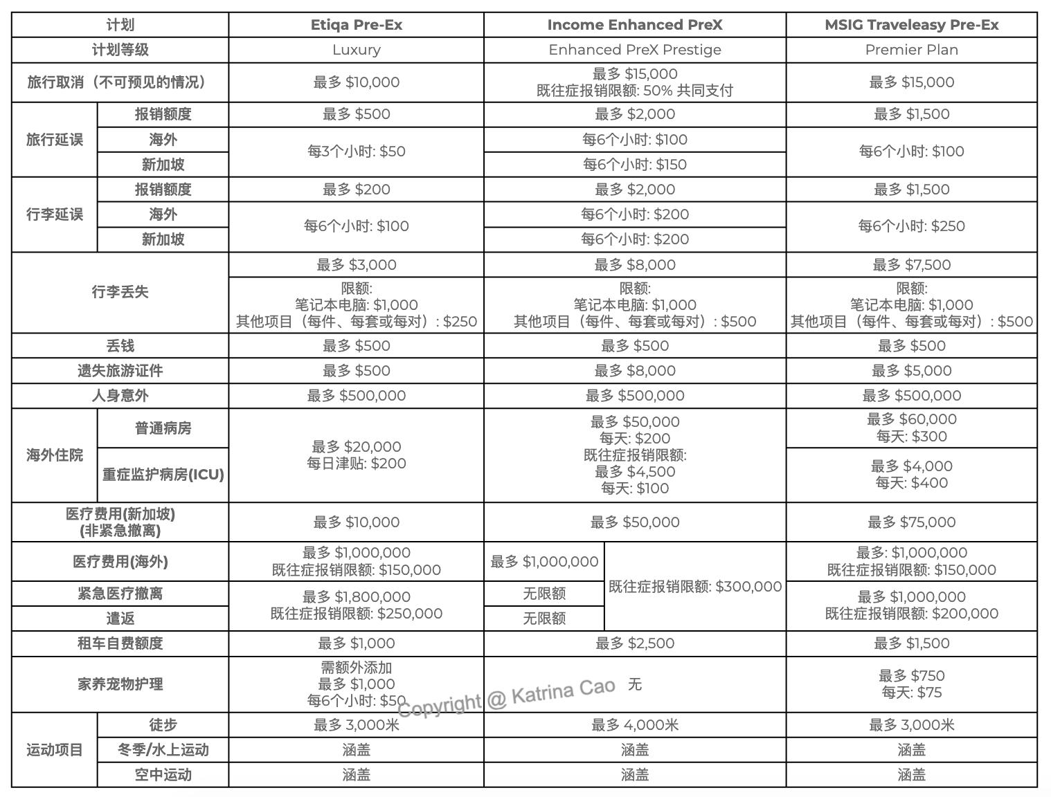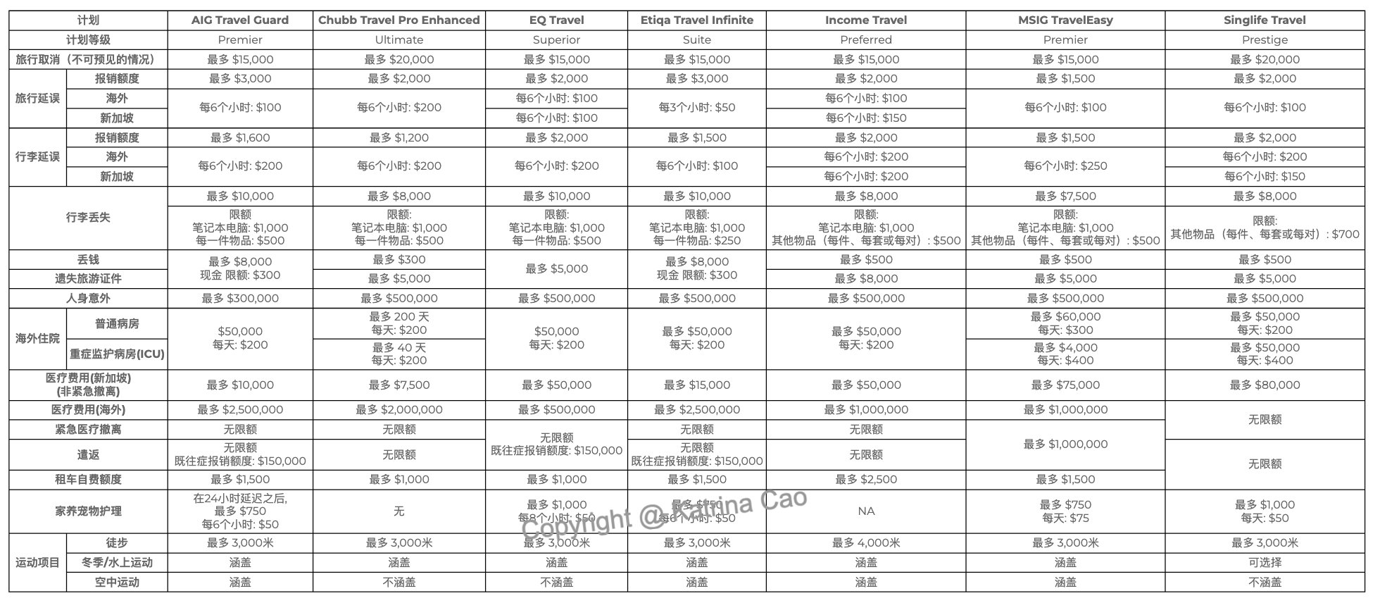 旅行保险计划通常分为两种:覆盖既往病史的计划和不覆盖的计划。以下是一些保险公司的对比信息: