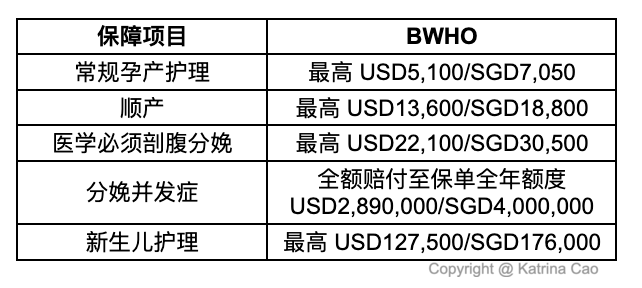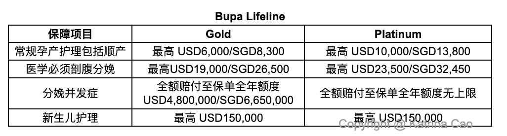 Bupa在新加坡是与RHI(Raffles Health Insurance来福士保险公司)合作,但是背后核保及报销等服务都是隶属于Bupa自己团队在运营,所以无需担心Bupa在新加坡的服务。Bupa保柏号称高端险中的爱马仕,其报销体验及服务在市场口碑是非常好的,除了贵,大概没啥毛病。Bupa保柏有两款产品提供孕产福利。其一为 Lifeline Classic 和 Gold计划 ;其二为BWHO计划都能提供全面的孕产保险。两款产品的主要区别为孕产等待期,Lifeline仅10个月等待期,而BWHO需要24个月等待期。Bupa也无需夫妻绑定方可配置孕产保险,且每一个保险年度会刷新孕产额度。以下是其计划孕产额度的对比。