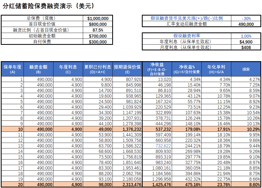 如果客户做保费融资,按首日现金价值(大约24万)的90%贷款,那么可以贷到大约21.6万美元(24万×90%),自己仅支付10.3万美元(31.9万-21.6万)。在此情况下,保单的初始保障杠杆就一下子提高到了(300万-21.6万)÷10.3万≈27倍。