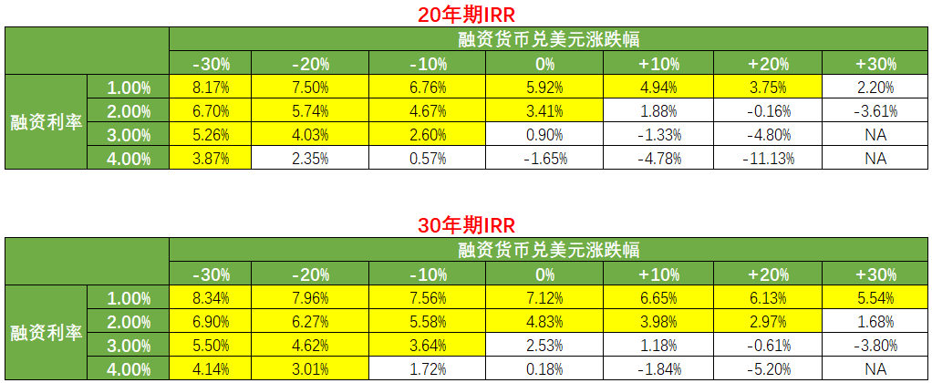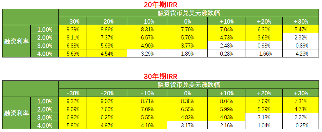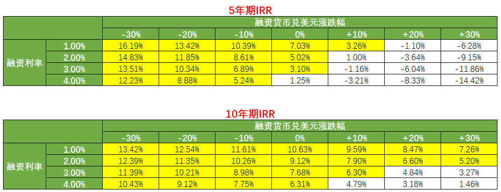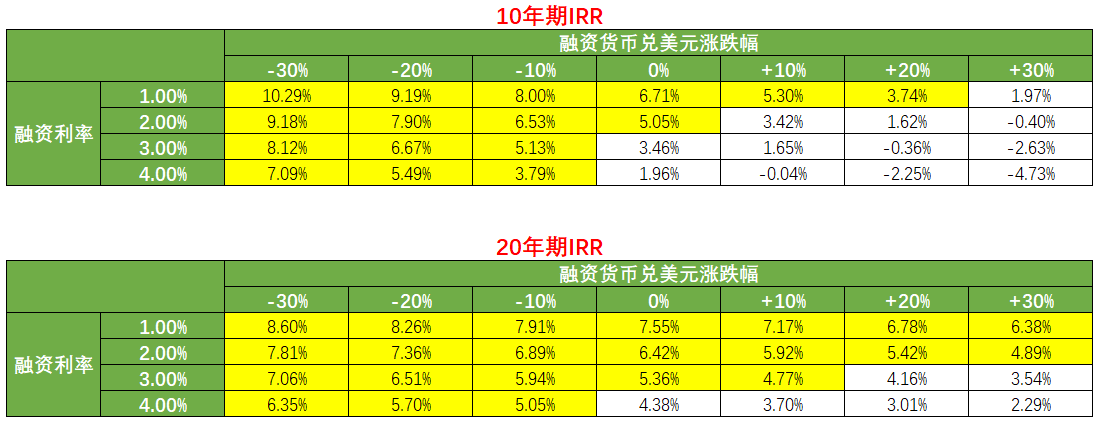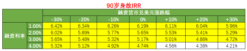 如果我们调整利率和汇率,得出来的90岁过世时的IRR如下表。
