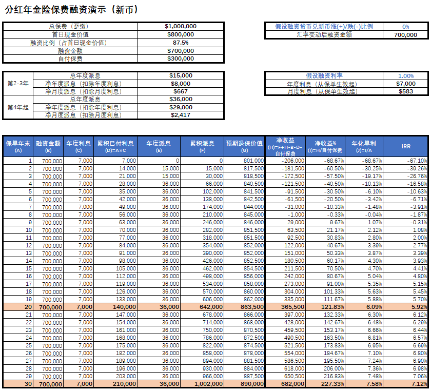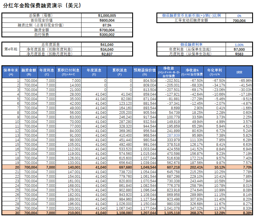 再看保费融资的情况。客户还是自付30万美元,另外再跟银行借70万美元,总保费达到100万美元。按当前瑞士法郎一月期融资利率为1%,客户每年一共需要向银行支付7,000美元的利息(70万×1%)。从第4年开始,客户每年能净领取的金额是34,040美元,约为本金的11.35%(34,040÷30万)。如果客户第20年退保,扣除贷款本金后可以再一次性拿回约34.9万美元,彼时IRR为7.70%;若第30年退保,扣除贷款本金后可以再一次性拿回约50.7万美元,IRR为8.38%。