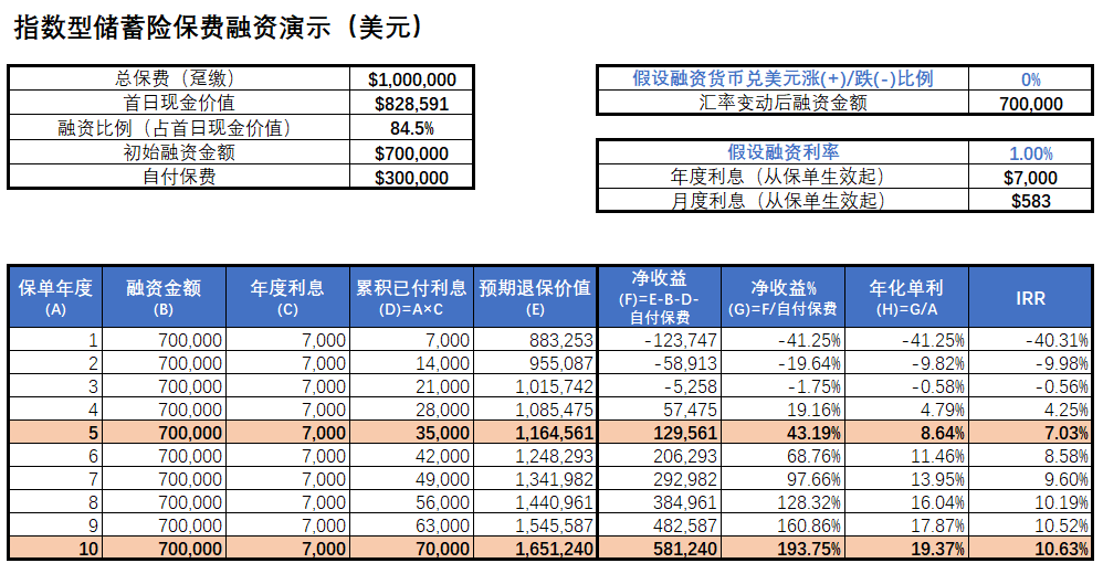 我们以F公司的一款指数型储蓄险举例。没有保费融资的情况下,假设客户一次性缴纳30万美元保费,如果第5年选择退保,可以一次性拿回约34.9万美元,IRR为3.09%;若第10年退保,可以一次性拿回约49.5万美元,IRR为5.14%。
